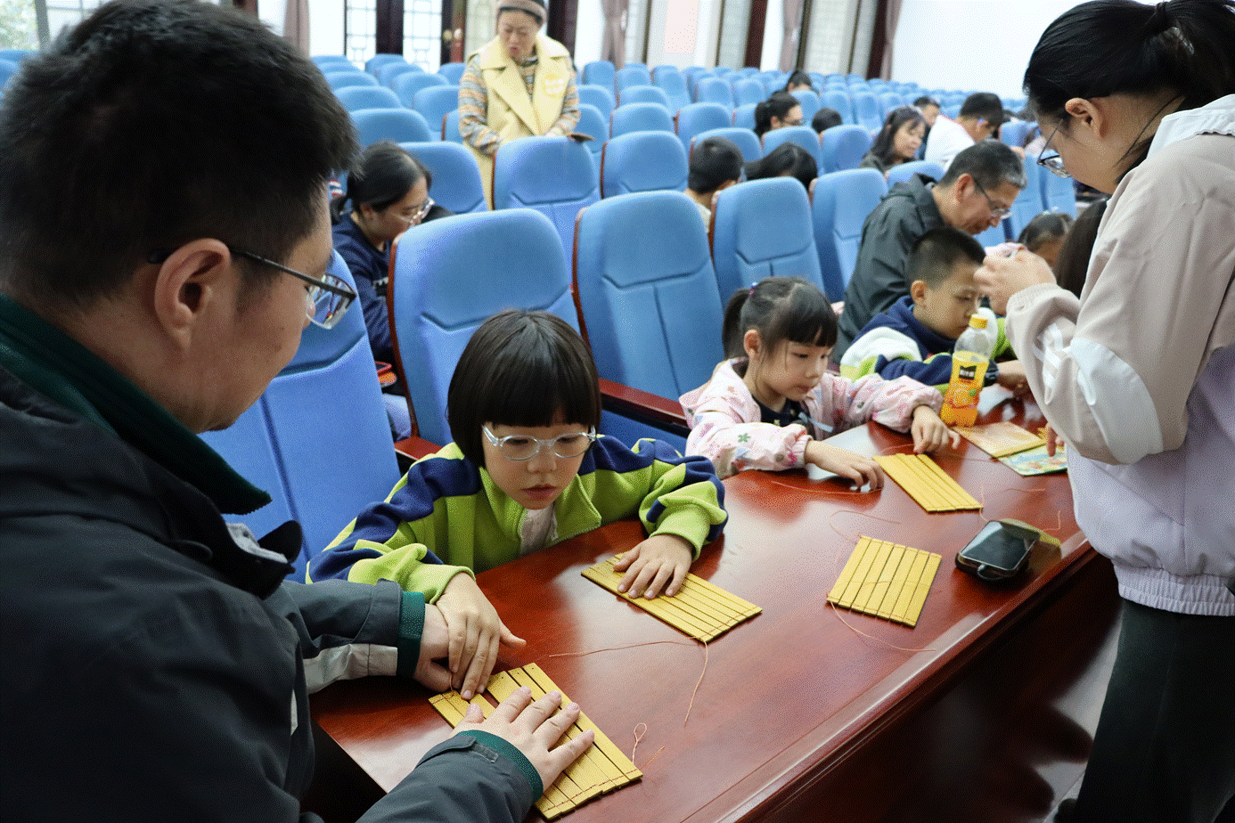 午后的第一项活动是竹简手工制作及《出师表》手书。专业老师现场指导,家庭为组,竹简、麻绳、黑笔等,演绎了“汗青”的工艺,书写了《出师表》的“丹心”,打造了一个有趣味的寓教于乐现场。