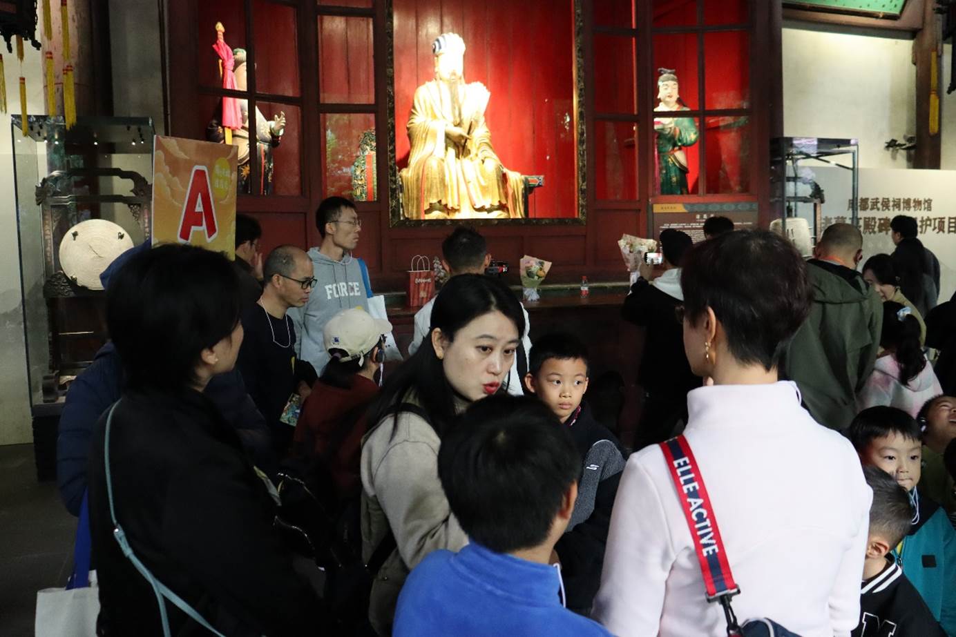 沿中轴线而行,“桃园三结义”“煮酒论英雄”是孩子们眉飞色舞的故事,殿内岳飞手书的《出师表》碑刻,诸葛鼓、木牛流马模型,勾出孩子们的种种好奇。院内的红墙竹影,成为家长孩子们的打卡点,跳动与安静,刹那间定格。